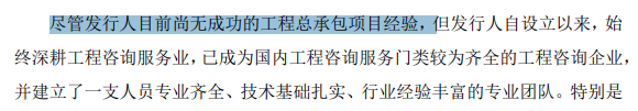 中诚咨询在此前披露的问询回复中提及,工程总承包业务具备产业政策和行业市场规模的强大支撑,且能够与公司现有业务取得良好的业务协同,公司新增工程总承包业务具有必要性。另外,公司具备工程总承包业务的人员储备和技术储备,且公司全资子公司江苏中发建筑设计有限公司已签订工程总承包合同1项,合同总金额约4.21亿元。未来,公司将利用自身竞争优势积极拓展工程总承包市场。