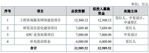 本次IPO,中诚咨询拟募资约2亿元,分别用于工程咨询服务网络建设项目和研发及信息化建设项目。而之前的招股书显示,中诚咨询拟募集资金约3.3亿元,募集资金总额扣除发行费用后,拟用于工程咨询服务网络建设项目、研发及信息化建设项目、EPC业务拓展项目、补充流动资金。